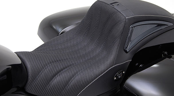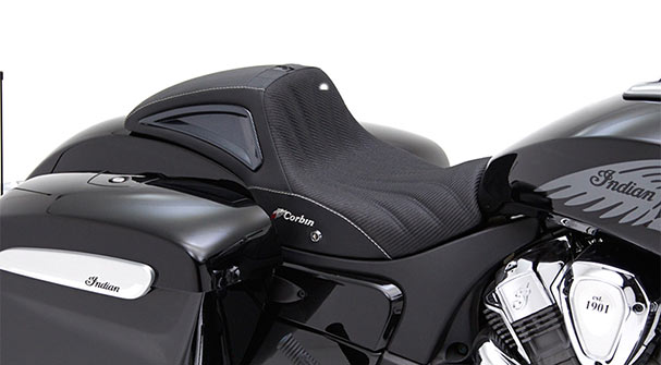 And of course, you can spec your saddle with a wide range of genuine leather options at no extra charge. It breathes, it breaks in, and it conforms to your shape over time. Shown here: Black Carbon-Fiber leather seating, Matte Black sides, tail and trim, Black Stealth stitching, Natural Heavy Assembly stitching, Silver Indian design Corbin logo, and mock carbon-fiber finishing plates for that extra flair.