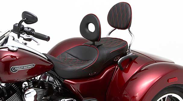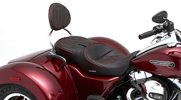 Corbin’s Dual Tour saddle also works with the OEM removable sissybar if you prefer. Use the Corbin Dual Tour with the HD pad on the sissybar or choose either of our coordinated passenger backrests pads. Our standard model offers a nice wide, contoured contact patch for excellent support. Corbin’s passenger armrest not only offers maximized body support, but also provides armrests for real touring luxury. This design is especially helpful on the Freewheeler as it helps your passenger to easily resist the centrifugal force felt on a trike during cornering. Comfort AND security!