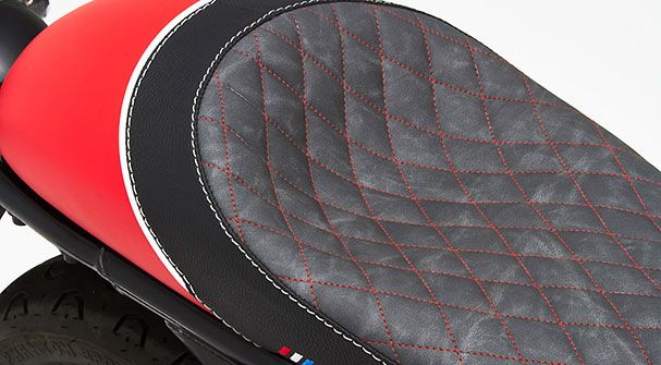 On top, we include genuine leather seating panels for a luxurious ride and a wide range of custom material options at no extra charge. Above we show it in the following: Grey Bomber Jacket leather seating, Natural Black sides, Ninja Red tail section, White welt, Red stitching and Gold logo.