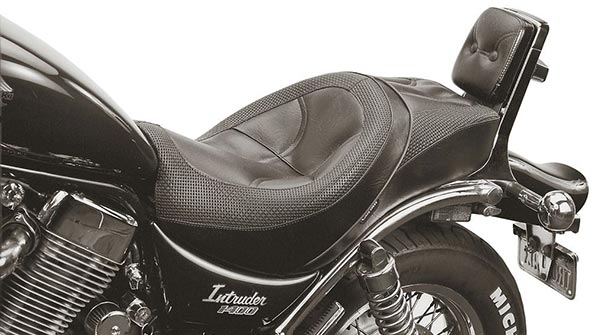 Dual Touring Saddle offers extraordinary comfort gains for two riders on the 1400 Intruder with the attractive styling you expect from Corbin. Large supportive bucket offers plenty of back support for the driver and helps to keep you in place on the motorcycle. Wider passenger platform provides your co-pilot with a touring quality saddle. Enjoy your Intruder more! Graceful flowing line along the chrome fender brace and attractive stitch pattern lend to the overall appearance. Both saddles are available color coordinated (Dual touring saddle includes genuine leather seating panel inserts.)