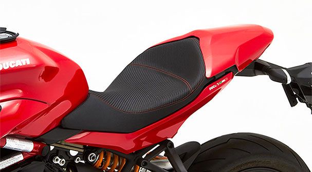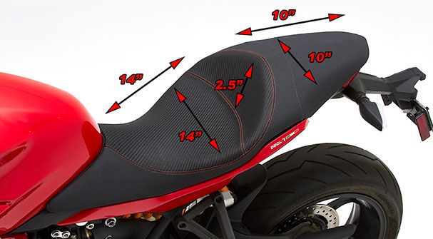 On the outside we use genuine leather seating for a luxurious ride that breathes with your body. Leather will break in along with the foam to support the personalized fit. We’ve designed a cover pattern that allows you to keep a custom, yet subtle look or choose from a variety of colored material options at no extra charge for high visual impact. Shown here with Carbon-Fiber leather seating, Asphalt sides & tail and Red stitching. We do not recommend colored welts on this model as it would interfere with fit of the Ducati seat cowl.